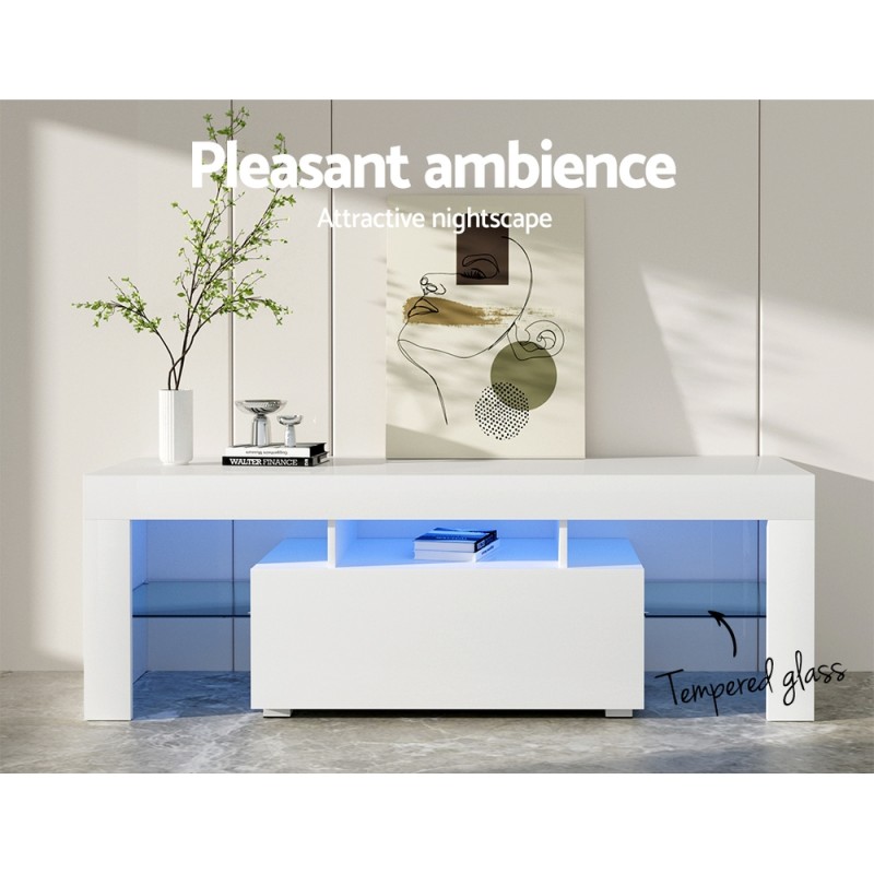 Elevate your living space with the Artiss Entertainment Unit TV Cabinet LED 130cm in White. This stunning piece combines modern design with functionality, featuring customisable RGB LED lighting with 16 colours and 4 flashing modes. Its sleek, handle-free design includes ample storage with tempered glass shelves. A UV high-gloss finish adds elegance, making it a perfect fit for any contemporary home. Easy to assemble, this unit is sure to impress guests and enhance your entertainment experience.