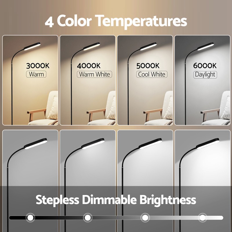 Brighten any room with the Artiss LED Floor Lamp, a perfect blend of modern style and smart functionality. Effortlessly tailor your lighting with stepless dimming and four adjustable colour temperatures, ideal for reading, relaxing, or working. The ultra-flexible 360° gooseneck lets you direct light with precision, while the handy remote control offers wireless convenience from up to 15 metres away. With an energy-efficient 12W output, flicker-free illumination, and a sturdy base, this lamp is a stylish and practical addition to your home or office.