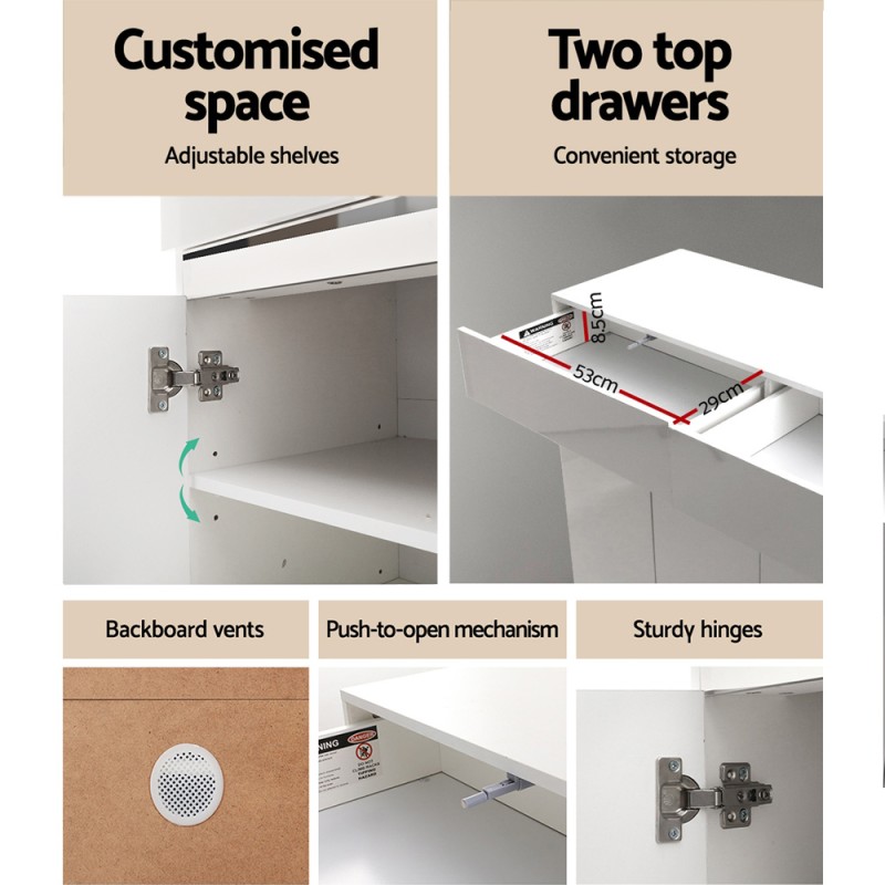 Introducing the Artiss Shoe Rack Cabinet, a stylish and practical solution for shoe enthusiasts. This high-quality cabinet offers adjustable shelves to accommodate up to 26 pairs of shoes, with two cupboard areas for organised storage. Featuring a sleek UV high-gloss finish on the front, backboard vents, and a push-to-open mechanism, this cabinet is both functional and elegant. Built with durable 12mm particle board and MDF, it's a perfect addition to any home entrance. Note: High-gloss finish is on the front only.