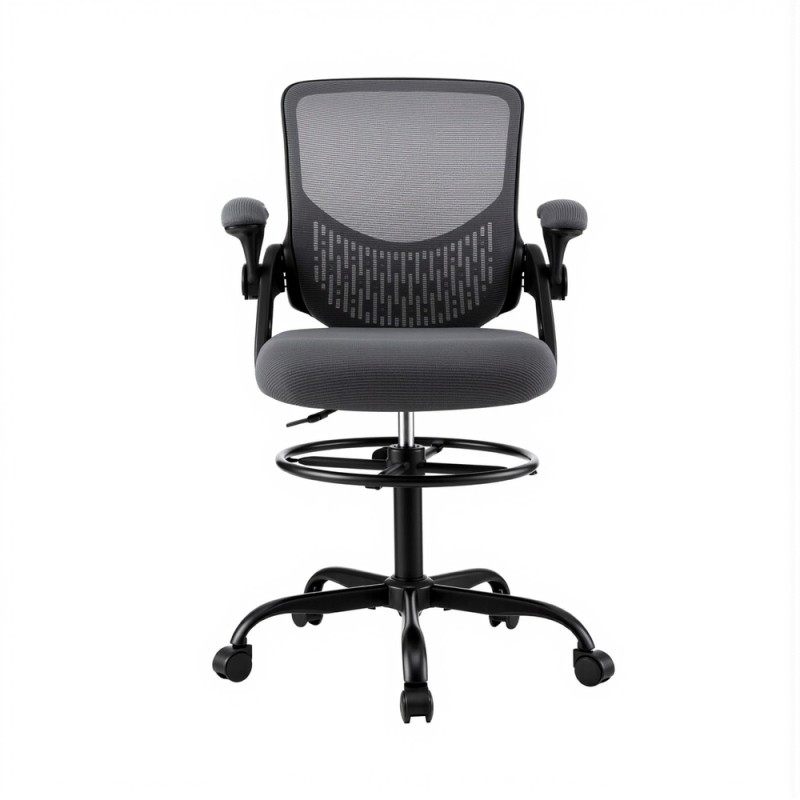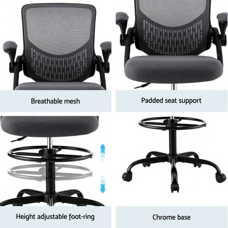 Upgrade your workspace with the Artiss Mesh Drafting Office Chair. Designed for comfort and style, it features a breathable mesh backrest, contoured support, flip-up armrests, and a height-adjustable seat and footrest ring for personalised use. The 360-degree swivel and stylish chromed base add modern flair, making it ideal for home or office studios. With a sturdy build and 150kg capacity, this chair adapts seamlessly to your needs and comes with a 1-year warranty.