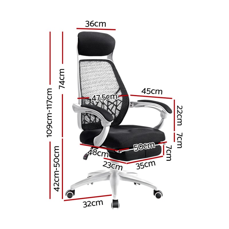 Discover the ultimate blend of work and relaxation with the Artiss Mesh Office Chair Recliner in Black and White. Designed for comfort, this chair boasts a breathable mesh for ventilation and an S-shaped lumbar support for your back. Recline up to 150° with ease, supported by a retractable footrest and adjustable armrests. The built-in storage keeps essentials handy, while mute castors ensure smooth, quiet movement. Elevate your office experience with this versatile chair.