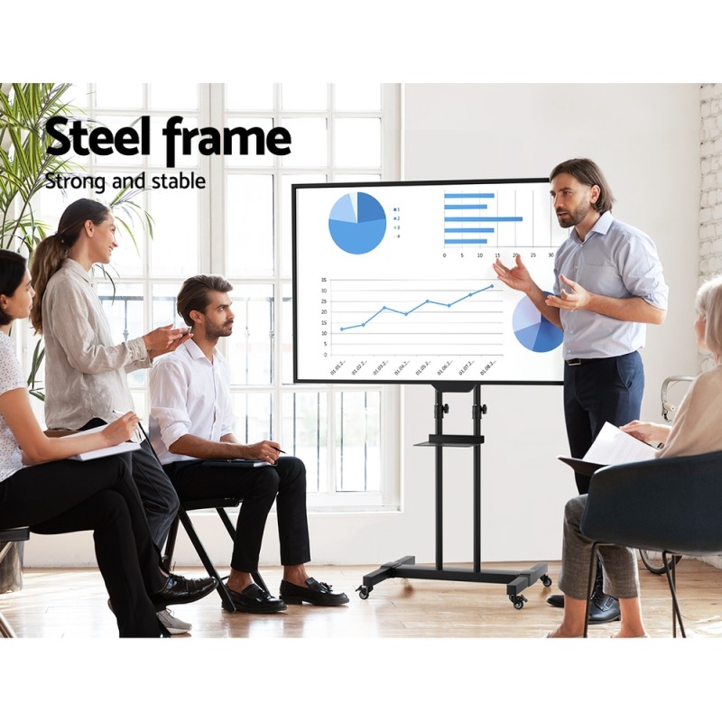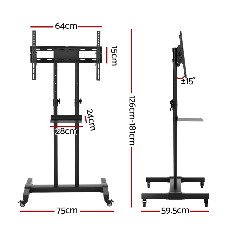 Enjoy seamless entertainment anywhere with the Artiss Mobile TV Stand, designed for TVs from 23" to 65". Crafted with a high-quality black powder-coated steel frame, it supports up to 40kg and fits both curved and flat screens with flexible VESA mounting. Easily adjust the height from 126cm to 183cm for optimal viewing, move it effortlessly with rotating castor wheels and brakes, and keep your setup tidy with integrated cable management and a tempered glass shelf. A safety bolt and sturdy base ensure your TV stays secure wherever you go.