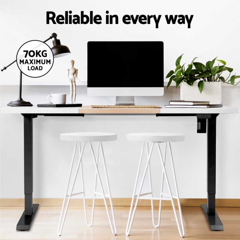 Boost your workday with the Artiss Motorised Standing Desk, featuring a dual-motor system for seamless height adjustments. Its sturdy, powder-coated metal frame and adjustable length make it versatile for various spaces. The easy-to-use control panel ensures smooth and quiet operation, while reinforced rubber foot pads provide stability. With pre-drilled holes and a glossy finish, the matching desktop is ready to assemble, making this desk an ideal addition to any modern workspace.