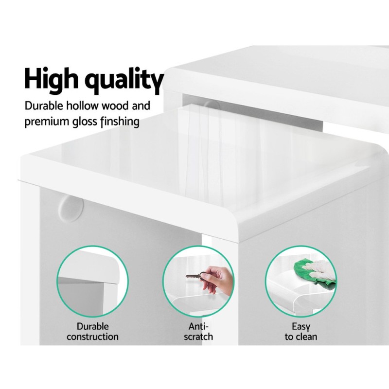 Elevate your living space with the Artiss Nesting Coffee Table Set of 3 in Glossy White. This contemporary trio, crafted from high-quality hollow wood, boasts a sleek high gloss finish with a durable PU and UV lacquer, making it both water and scratch resistant. Perfect for any room, these tables are truly multi-functional, offering three different sizes to suit your needs. Not only are they stylish, but they are also easy to clean and assemble, ensuring both convenience and elegance in your home.