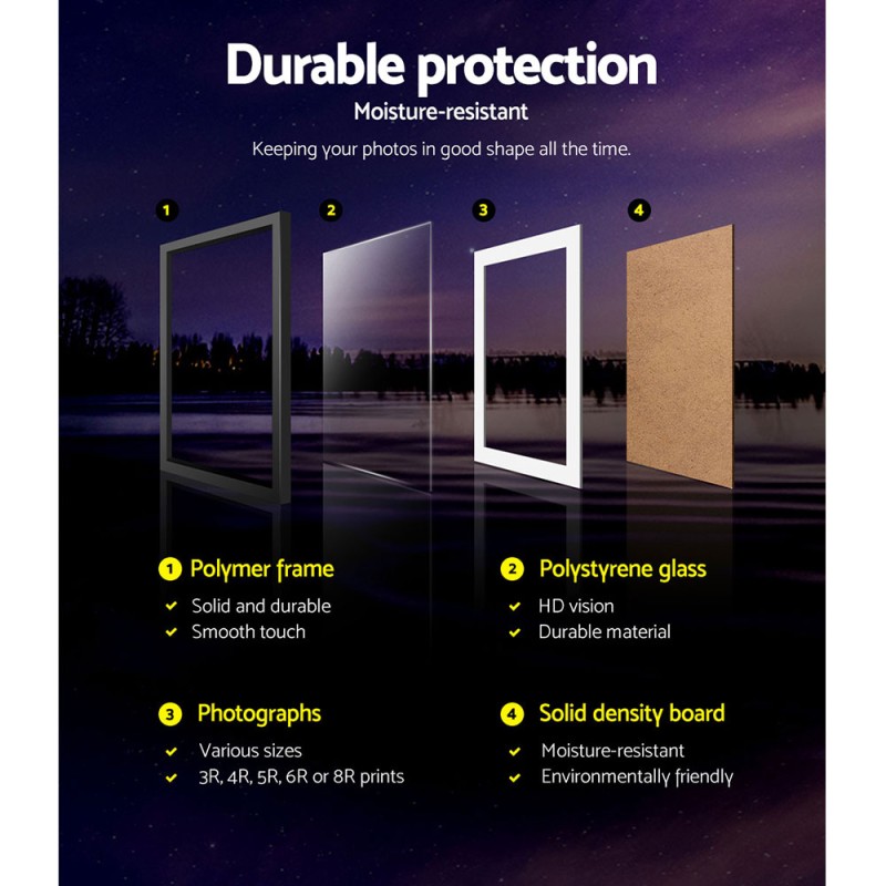 Capture and display your most cherished moments with the Artiss Photo Frame Set, a stunning collection of 26 black frames designed to elevate any room's decor. This versatile set accommodates various photo sizes from 3R to 8R, offering creative freedom to arrange your pictures in portrait or landscape orientation. Crafted from durable polymer with polystyrene glass, these frames ensure your photos remain pristine. The moisture-resistant hardboard backing adds longevity, while included hanging accessories make installation effortless. Whether creating a gallery wall or showcasing individual stories, these frames transform your memories into art.