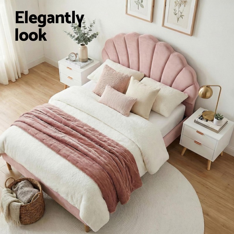 Elevate your bedroom aesthetics with the Artiss Double Bed Frame and Bedside Table set. The bed features a luxurious scallop-shaped pink velvet headboard, a sturdy wooden construction, and Velcro-enabled slats for easy set-up and a 300kg capacity. Complementing the bed, the sleek white bedside table offers two spacious drawers with aluminium handles, metal runners, and pine wood legs for a modern touch. With smooth edges, floor protectors, and easy maintenance, this set combines style and functionality. The bed's dimensions are 204x144x105cm, and the table measures 50x40x50cm, perfectly fitting standard Australian mattresses.