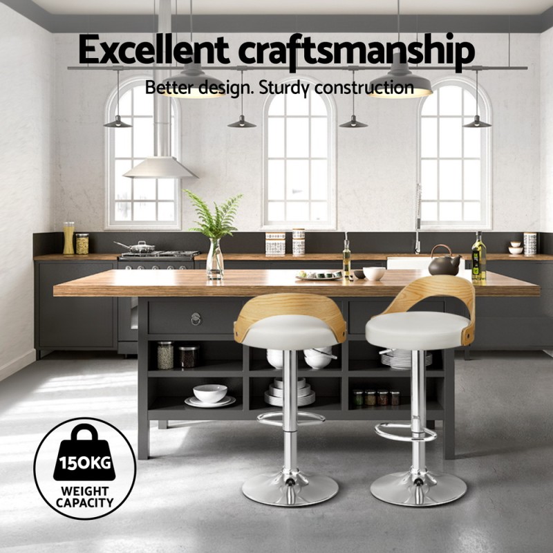 Elevate your space with the Artiss Publia Bar Stools, offering a blend of elegance and contemporary design. Perfect for any setting, from your kitchen to the bar area, these stools feature a curved bentwood seat with premium PU leather upholstery. Enjoy comfort with a padded seat, and convenience with a 360Ëš swivel and adjustable height. The sturdy base and floor protectors ensure stability and scratch-free floors. Add a touch of luxury to your home with Artiss.