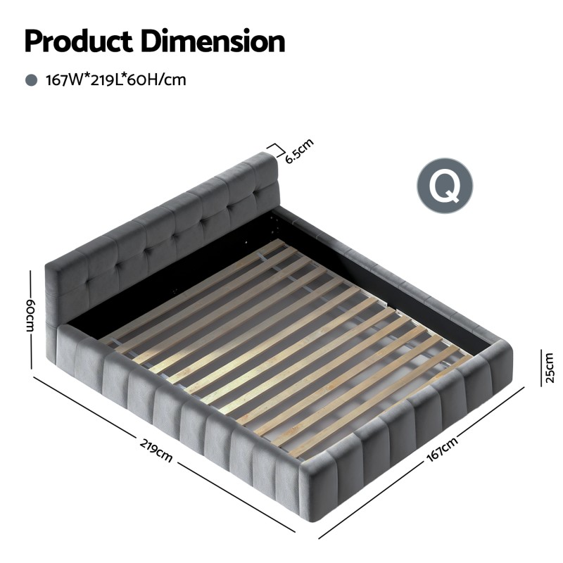 The Artiss Queen Size Bed Frame in Grey is a perfect blend of elegance and functionality for your modern bedroom. Featuring a plush velvet headboard inspired by floating clouds, this bed frame is both stylish and comfortable. It boasts a sturdy plywood-pine frame reinforced with high-quality metal fixings and 14 supportive slats, providing a 300kg weight capacity. The smooth-edge velvet upholstery adds a touch of luxury while ensuring safety. Designed for quick and easy assembly, this platform base fits standard queen mattresses (153x203cm) effortlessly, making it an ideal upgrade for any bedroom.