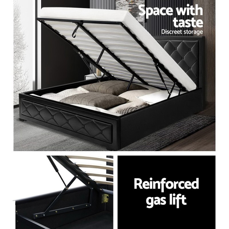 The Artiss Tiyo Gas Lift Bed Frame Queen Size in Black is the epitome of modern sophistication and practical design. Wrapped in premium PVC leather, its tufted headboard and sides showcase exceptional craftsmanship and luxury. Beyond its stunning appearance, this bed frame features a gas lift system with a hand strap, revealing generous storage space beneath its wooden arched slat base. This base is designed to flex for optimal weight distribution and reduce partner disturbances. With a sturdy, reinforced wooden construction, heavy-duty metal connectors, and easy assembly, the Tiyo Bed Frame promises both style and functionality, ensuring you sleep beautifully and smartly. Mattress not included.