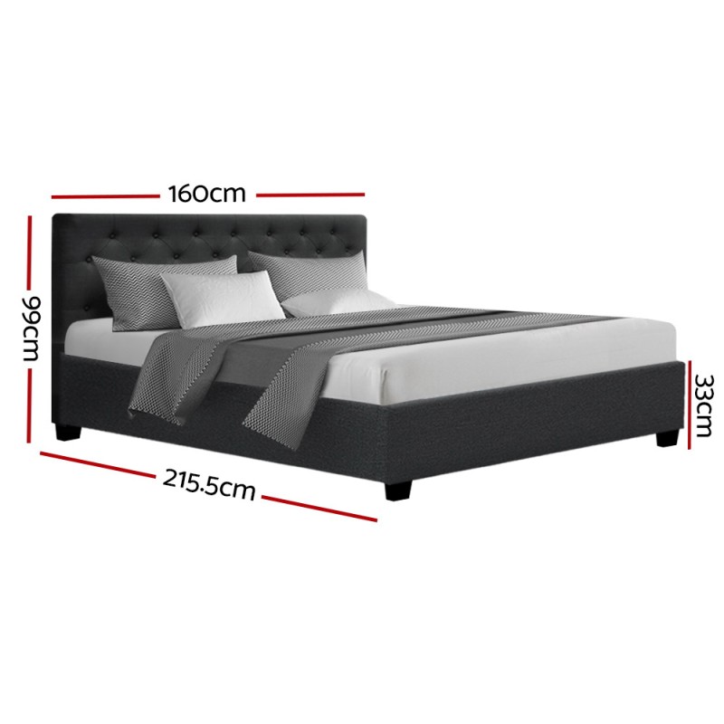 Elevate your sleeping experience with the Artiss Vila Queen Size Bed Frame in elegant charcoal. Crafted with premium faux linen fabric, it features a grand tufted headboard and high-density foam padding for ultimate comfort. The ingenious gas lift storage system reveals ample space beneath the wooden arched slat base, perfect for storing out-of-season clothing or extra bedding. Reinforced with steel bars and heavy-duty metal connectors, the frame ensures sturdy support, while the adjustable centre support beam minimises movement disturbances, offering a luxurious and restful night's sleep.