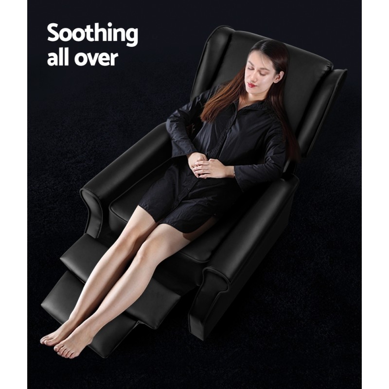 Experience gold class comfort at home with the Artiss Recliner Armchair. Padded with high-resilience foam and upholstered in sleek black faux leather, this chair is perfect for any room. Easily adjust the backrest and footrest for your ideal relaxation angle. With a sturdy steel base and solid wood legs, it's built to last. Whether in the study, living room, or media room, unwind in style and comfort.