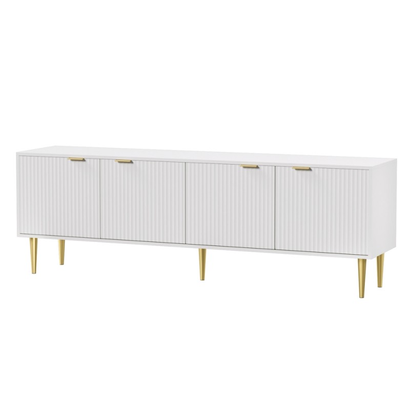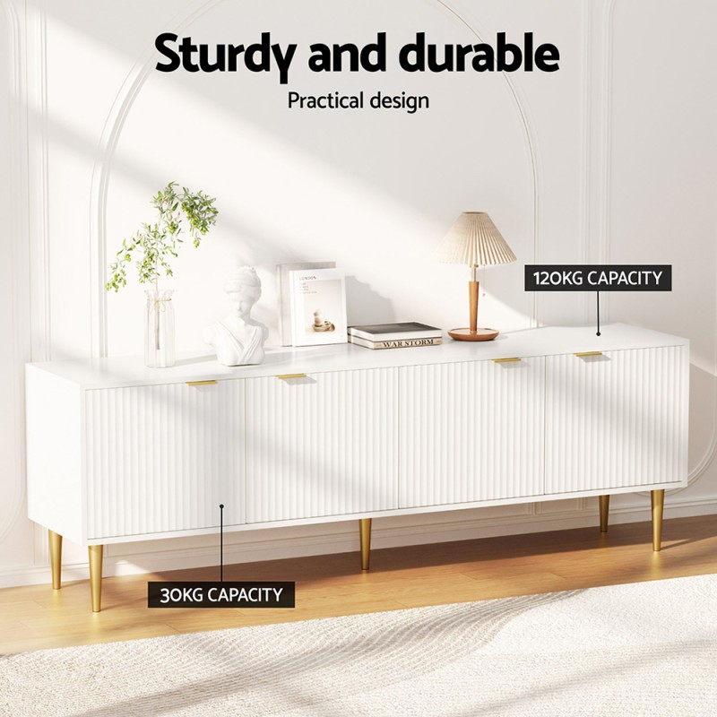 Introducing the Artiss Riley Entertainment Unit, a stylish addition to your living space. This unit features a 4-door cabinet with reeded door panels, adding a touch of elegance. With its sturdy construction and metal golden legs, it combines durability with modern flair. Practical and aesthetic, it includes floor protectors and cable management for organised wiring. With high weight capacity, it's perfect for your devices and accessories. Easy to assemble, the Riley Unit enhances your entertainment area effortlessly.