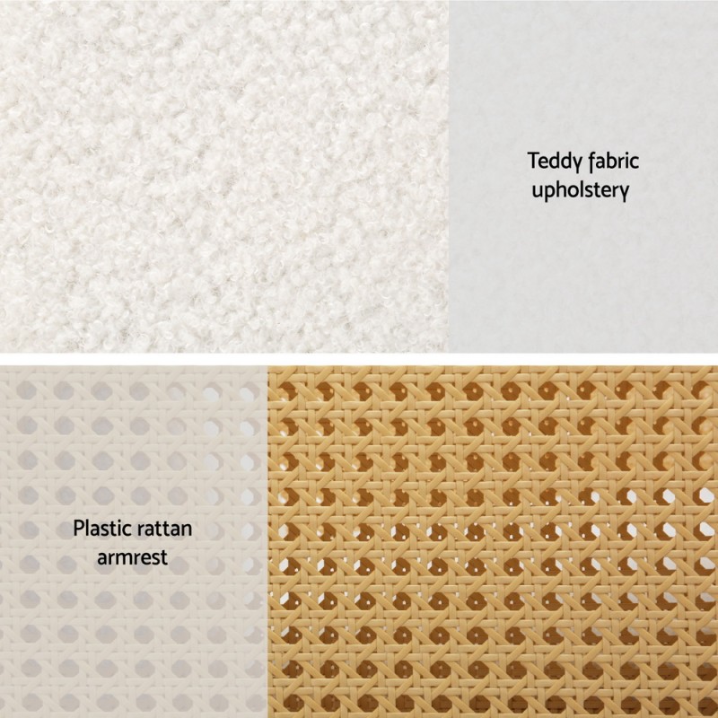 Unwind in style with the Artiss Armchair Rocking Chair. Wrapped in plush teddy fabric and elegant PE rattan, this chair blends vintage charm with modern comfort. Its gentle rocking motion and thick cushioning create a perfect relaxation spot. Built with a sturdy rubber wood frame, it supports up to 150kg. Anti-slip pads protect your floors, while rattan armrests add a practical touch. Ideal for nursing or leisure, this chair is your cosy retreat. Assembly required. Includes a 1-year warranty.