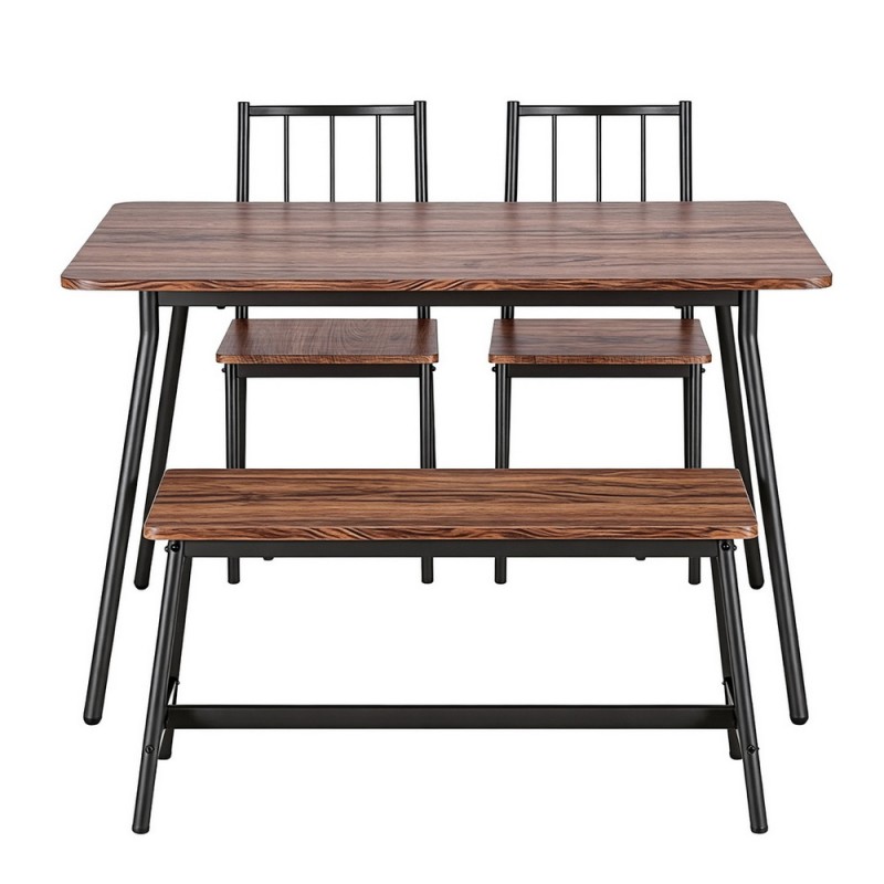 Transform your dining area with the Artiss Dining Table and Chairs Set. Designed for style and functionality, this 4-piece set is perfect for small spaces. Featuring a Rustic Brown wood-look surface and a sleek Black frame, it exudes a contemporary industrial charm. The set includes a spacious table, two stable chairs, and a comfortable bench, all supported by a durable powder-coated metal frame. Easy to assemble and maintain, this set is ideal for both dining and work. Make your meals memorable with Artiss, where elegance meets efficiency.