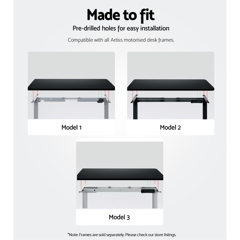 Enhance your workspace with the Artiss Standing Desk Top in Black, designed to pair seamlessly with our motorised desk frames. Crafted from eco-friendly particle board, this 120cm x 60cm desk top boasts a 2.5cm thickness for durability. Its smooth, rounded edges ensure safety, while an anti-scratch, easy-clean matt finish showcases the natural wood grain. With pre-drilled holes, installation is a breeze. Choose from four stylish colours and enjoy a 1-year warranty for peace of mind.