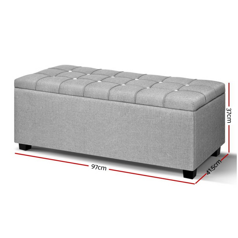 Enhance your home with the Artiss Storage Ottoman Blanket Box. This 97cm beauty, upholstered in luxurious faux linen with a tufted button design, adds plush elegance to any space. Its generous storage is perfect for blankets, pillows, and more, while the triple soft cushion-top provides a comfortable seat or footrest. With solid wood construction, robust hinges, and detachable legs, this ottoman is as functional as it is stylish.