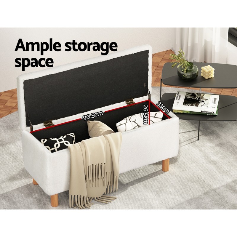Introducing the Artiss Storage Ottoman Blanket Box in elegant white boucle fabric, a perfect blend of style and function. Upholstered in premium boucle, this ottoman adds warmth and texture to your living space. It features an ultra-soft, high-resilience foam seat supported by a sturdy wood frame with a remarkable 300kg weight capacity. Lift the seat to access a spacious storage area that holds up to 80kg of items. Supported by quality rubberwood legs with floor protectors, it is easy to assemble and offers timeless charm to any home.