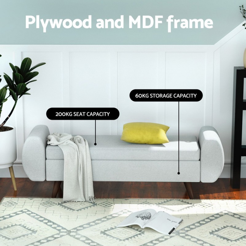 Introducing the Artiss Storage Ottoman Blanket Box Armrest, a stylish and practical addition to your home. Crafted with faux linen upholstery and a sturdy plywood and MDF frame, this 140cm grey ottoman offers comfort with high-resilience foam padding and ample storage space. Its sleek design features oak legs with plastic feet and is simple to assemble. Perfect for any room, it supports a seat load of 200kg and storage load of 60kg. Comes with a 1-year warranty for peace of mind.