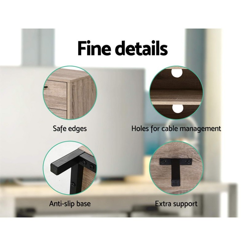 Transform your living space with the Artiss Tania TV Cabinet, a perfect blend of industrial chic and functionality. Crafted from 15mm particle board and sturdy powder-coated steel, this unit ensures durability and style. It features two drawers, a deep cabinet, and open shelves for all your gadgets, with sleek black metal handles adding a modern touch. Keep your cables neat with pre-drilled holes and enjoy a stable setup with an extra leg support. Ideal for any Aussie home, it comes with a 1-year warranty.