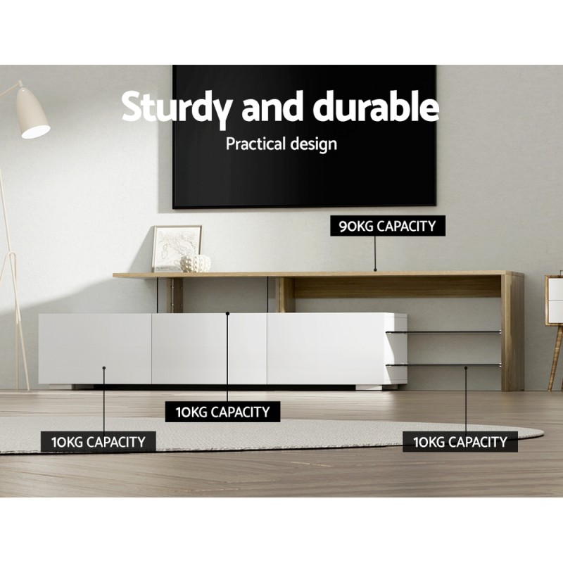Elevate your living room or home theatre with the Artiss TV Cabinet Entertainment Unit. Stylish and practical, this unit features a wide, low-profile design with dual-tone elegance. Crafted from robust 15mm particle board with a UV high-gloss front, it ensures durability. It offers three spacious drawers with smooth metal runners and two tempered glass shelves for organised storage. The anti-slip base provides stability. Easy to assemble and maintain, this unit is the perfect blend of function and style.