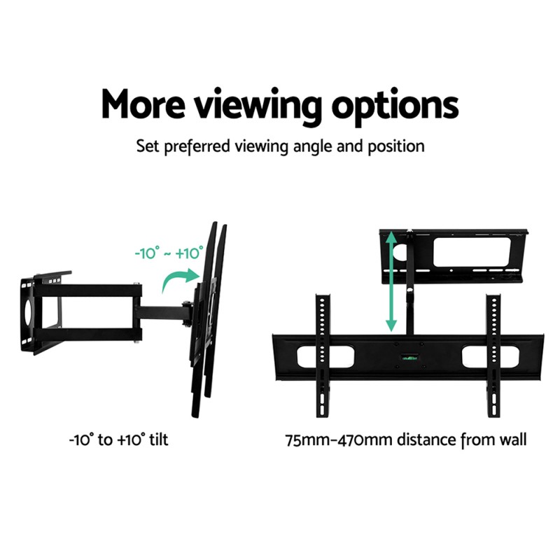 Enhance your entertainment setup with the Artiss TV Wall Mount Bracket, designed for 32"-70" LED LCD TVs. This sleek, black powder-coated iron mount combines robust strength with versatile functionality. Built to support up to 50kg, it offers flexible VESA compatibility and a multi-directional design for the perfect viewing angle, featuring -10° to +10° tilt and 180° swivel. A three-arm extension lets you position your TV precisely, while a safety lock ensures stability. Ideal for concrete or brick walls, this mount is your solution for space-saving, top-notch viewing pleasure.