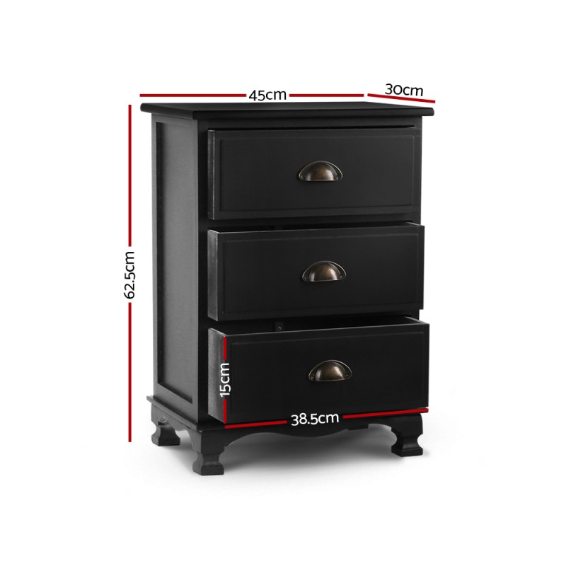 Embrace a touch of vintage elegance with the Artiss Bedside Table 3 Drawers Vintage - THYME Black. This exquisitely designed storage cabinet combines retro charm with practical functionality, featuring three spacious drawers adorned with vintage metal handles. Constructed from solid Paulownia wood, it offers a sturdy and durable structure with anti-scratch feet pads and round corners for safety. With a sleek black finish and non-toxic paint, it’s as stylish as it is safe. Best of all, this cabinet comes fully assembled and includes a wall mount for added security, ensuring a seamless addition to any room.