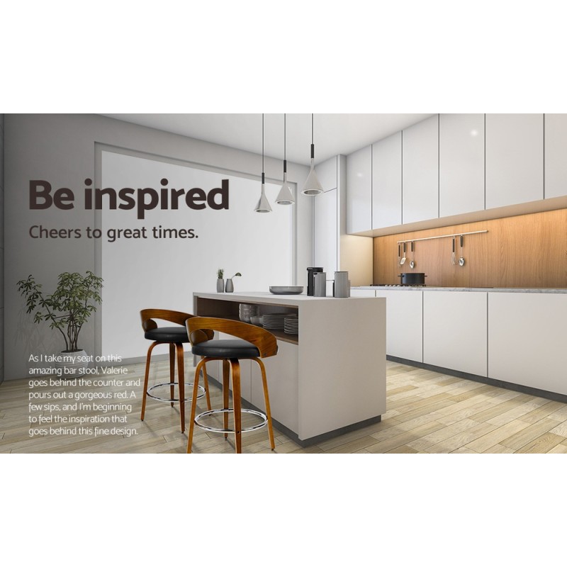 Elevate your home or bar space with the Artiss 4x Bar Stools, a set of four stunning pieces that combine timeless elegance with modern functionality. These Walnut Wooden Bar Stools are designed to be show-stoppers, bringing an instant update to any room. The warm walnut wood structure is harmoniously paired with a sleek chrome leg rest and a plush black seat made from premium PU Leather. The curved low backrest and swivel seat ensure comfort, while the chrome steel footrest adds a touch of sophistication. Complete with anti-slip rubber feet, these stools are as practical as they are stylish. Transform your space with Artiss.