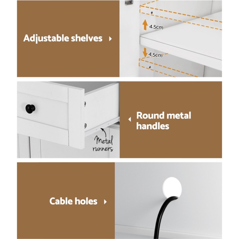 Elevate your home with the Artiss Beini Buffet Sideboard Cabinet—a perfect blend of elegance and functionality. Standing 180cm high, it features a wide countertop and ample storage with four doors, two adjustable shelves, and a spacious drawer. The quality wooden frame and sleek metal handles ensure durability and style, while smooth metal runners and a cable management hole add modern convenience. Easy to clean, maintain, and assemble, this white cabinet is ideal for dining rooms, kitchens, or living spaces seeking practical sophistication.