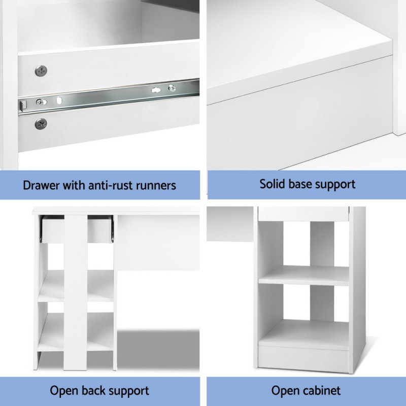 Upgrade your workspace with the Artiss Computer Desk Shelf Drawer Cabinet in sleek white. Crafted from durable E2 particle board with a melamine veneer finish, this 100cm office desk combines functionality and style. It offers ample storage options including open and adjustable shelves, a spacious drawer, an additional desk shelf, and a convenient slide-out keyboard tray. Keep your cables organised with the thoughtful cut-out hole in the back panel. This desk promises robustness and ease of maintenance with its easy-to-clean surface, making it a perfect addition to your home or office.