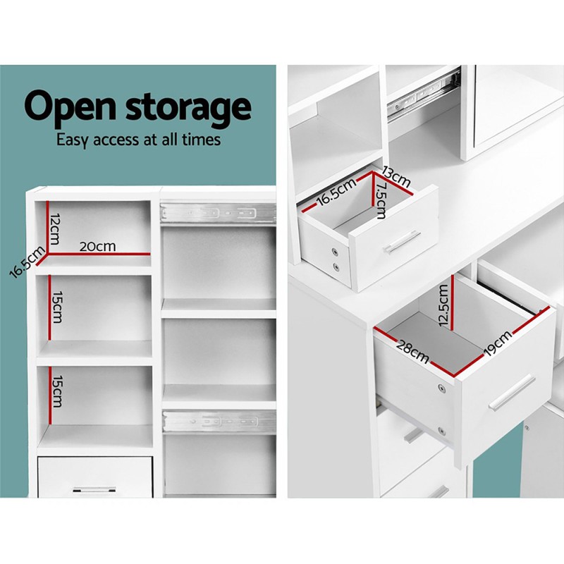 The Artiss Dressing Table Stool Set is a perfect blend of beauty and functionality. Crafted from sturdy particle board with a melamine finish, it features a space-saving sliding mirror that reveals hidden storage for your essentials. With three open shelves and five spacious drawers, including a lockable main drawer, organising your space is effortless. The set includes a well-padded stool for comfort, while the sleek white finish ensures easy cleaning and seamless integration into any decor.