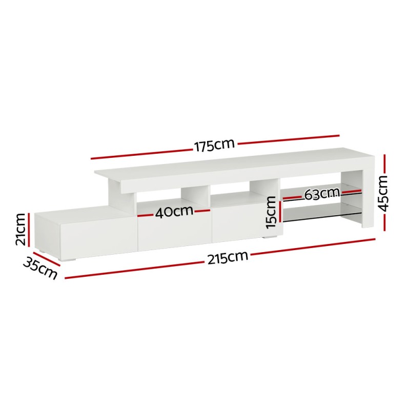 Enhance your living room with the Artiss Entertainment Unit TV Cabinet LED 215cm in White. This striking entertainment unit combines style and functionality, featuring customised RGB LED lighting with 16 colours and four dynamic modes. Crafted from durable 15mm particle board, it boasts a UV high-gloss finish and melamine for a sleek look. With spacious drawers and tempered glass shelves, it's perfect for organising your entertainment essentials. Easy to assemble, it promises a contemporary and unique aesthetic.