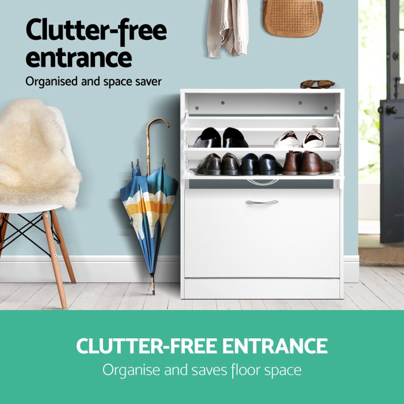 The Artiss Shoe Rack Cabinet in White Iris is your ultimate solution for a clutter-free entrance. Perfect for the shoe enthusiast, this contemporary cabinet offers organised storage for up to 24 pairs, depending on size. With three adjustable shelves per compartment, you can easily accommodate various shoe heights, ensuring effortless access and tidiness. Its sleek design and stylish handles blend seamlessly with any home decor. The sturdy construction and compact dimensions of 63 x 29 x 84 cm make it an ideal fit for any space. Arriving in well-packaged form, assembly is quick and straightforward, ready to house your footwear collection. Please note, for safety reasons, always anchor the cabinet to the wall and keep it out of reach of children.
