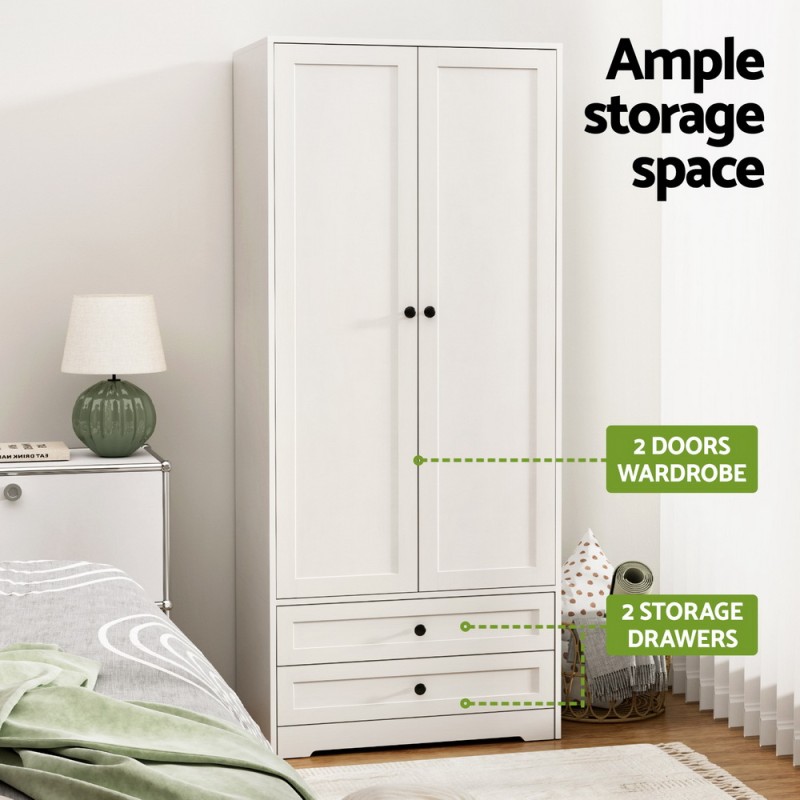 Transform your living space with the Artiss Wardrobe Clothes Closet Storage Organiser in elegant white. This modern wardrobe is tailored for Aussie homes, offering a compact yet spacious design with 2 storage drawers and 2 magnetic doors. Crafted from durable 15mm particle board with a stylish paper veneer finish, it features metal handles, hinges, and a detachable hanging rod for long-lasting use. The smooth sliding runners and high weight capacity ensure secure storage of your belongings, while the wall attachment kit adds extra security. Easy to assemble and maintain, its compact build is perfect for tight spaces, making organised, fuss-free living a reality. Enjoy peace of mind with a 1-year warranty.