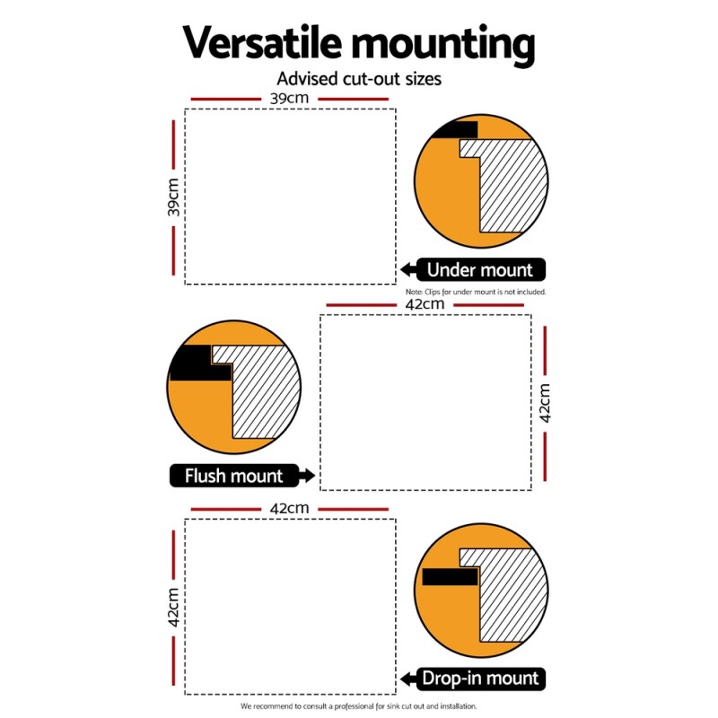 - Suitable for under mount, flush mount, and drop-in mount