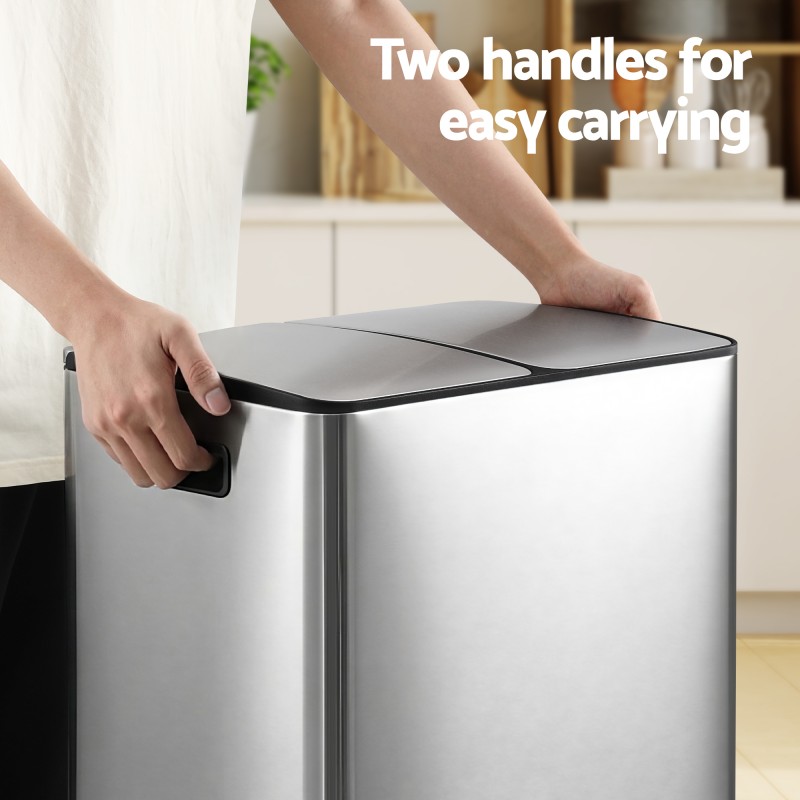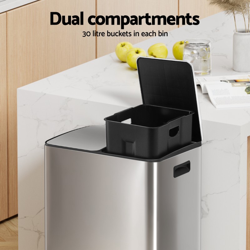 The Cefito Pedal Bin offers a modern rectangular design in durable carbon steel with a hygienic stainless pedal and soft closing lids. Its dual compartment layout holds two removable 30L buckets for a combined 60L capacity making waste sorting simple and tidy in kitchens or offices. Anti rust and waterproof construction plus easy clean surfaces deliver lasting performance and low maintenance.