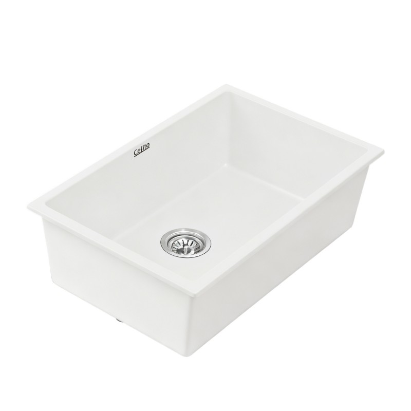 Transform your kitchen with the Cefito Kitchen Sink. This 70x45cm single bowl sink, crafted from 80% granite, offers unparalleled durability and elegance. Its dense, non-porous surface withstands daily use, resisting scratches, heat up to 280°C/536°F, and oil penetration, ensuring effortless maintenance. Designed with R10 round corners for easy cleaning, this sink is perfect for under mount, flush mount, or drop-in installations. Available in a chic white finish, it complements any kitchen style while providing a hygienic food prep area.
