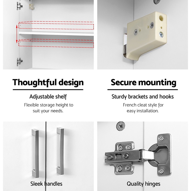 Transform your home into an organised haven with the Cefito Bathroom Storage Cabinet. Crafted from eco-friendly E1 engineered wood, this sleek wall-mounted cabinet offers two tiers of adjustable shelving for versatile storage. Its contemporary design, quality hinges, and elegant handles ensure seamless integration with modern décor. The French cleat mounting system ensures easy installation, making it ideal for enhancing space in any room. Declutter your lifestyle with this functional and stylish cabinet.