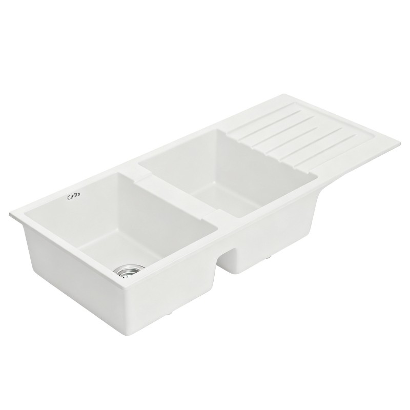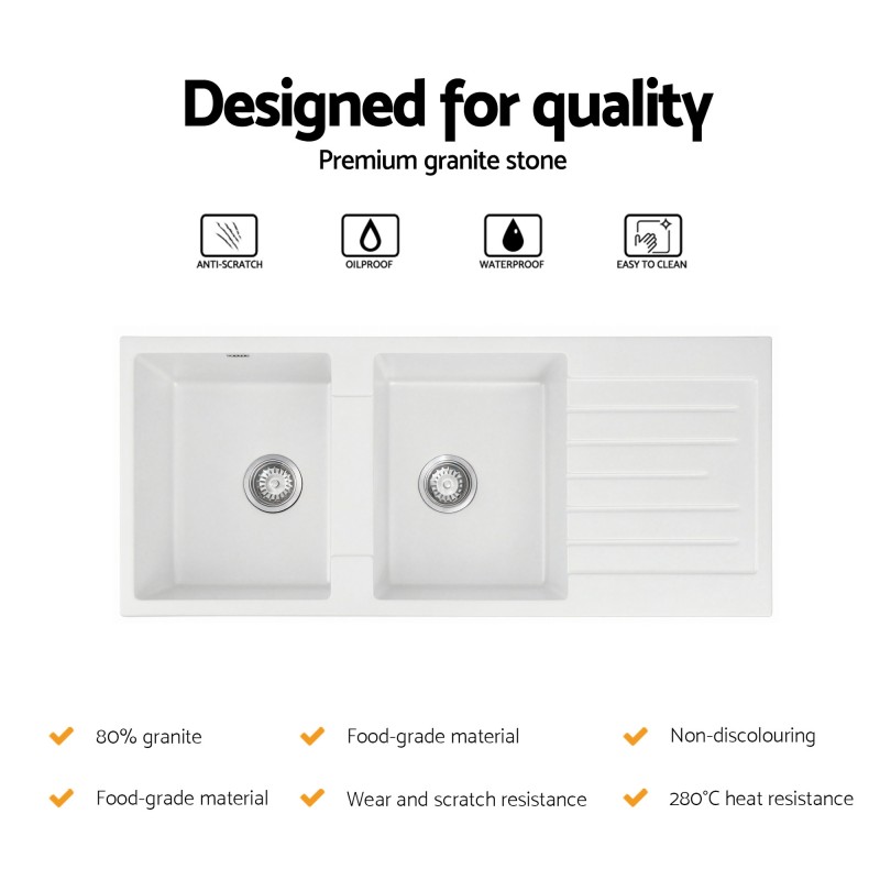Elevate your kitchen's functionality and style with the Cefito Kitchen Sink, a masterpiece of design and durability. Crafted from 80% high-quality granite, this 116x50cm double bowl sink in elegant white is engineered to withstand daily use with its impact and wear resistance. Its non-porous surface resists scratches, heat up to 280°C/536°F, and oil penetration, ensuring effortless maintenance. The food-grade material promotes hygiene, while the R12 round corners add a modern touch. Whether you prefer an under mount, flush mount, or drop-in, this versatile sink fits seamlessly into any kitchen aesthetic.