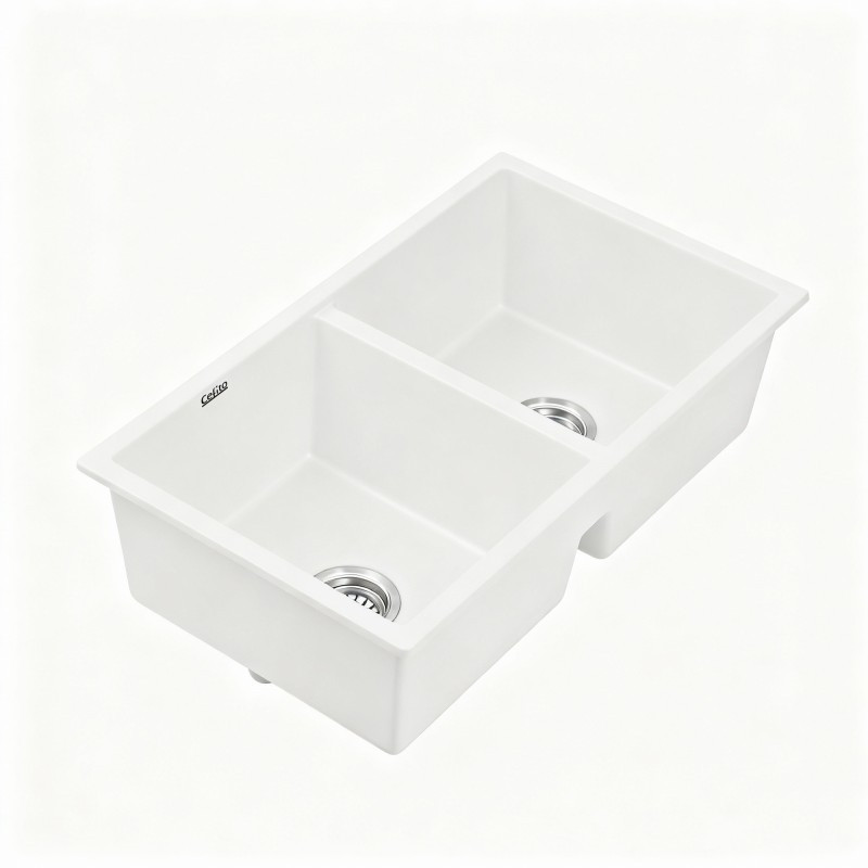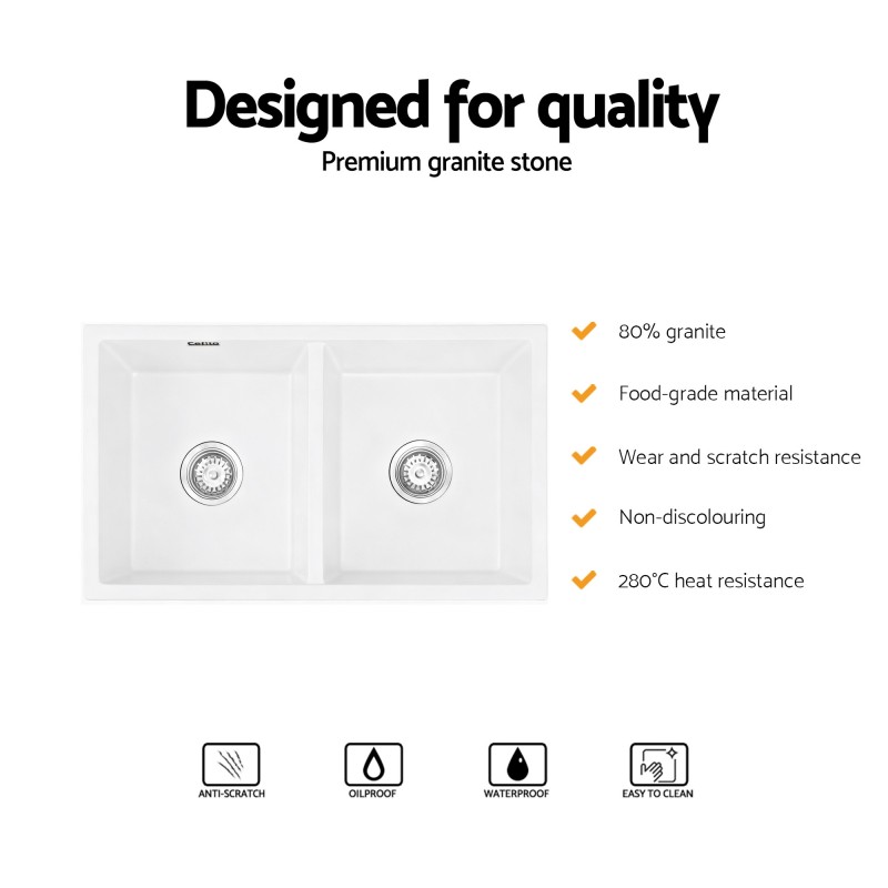 Transform your kitchen into a modern masterpiece with the Cefito Kitchen Sink, a stunning 77x45cm Double Bowl crafted from 80% granite composite for unmatched durability and elegance. This white stone sink is engineered to withstand the demands of daily use, offering resistance to scratches, high heat up to 280°C, and oil penetration, ensuring effortless maintenance and a pristine look. Designed with food-grade, non-porous materials, it provides a hygienic space for meal prep. Choose from versatile mounting options and enjoy the sleek R10 round corners for easy cleaning and a contemporary aesthetic.
