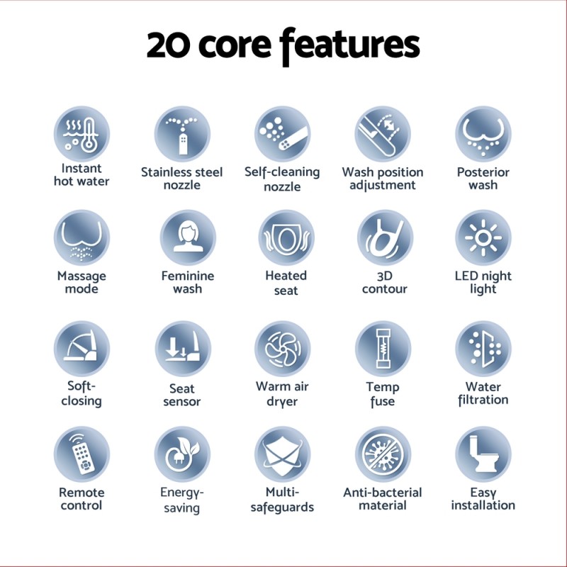 Elevate your bathroom experience with the Cefito Electric Bidet Toilet Seat Cover, featuring a luxurious heated seat, LED night light, and intuitive remote control. Enjoy personalised hygiene with adjustable water temperature and spray intensity, delivered through a self-cleaning stainless steel nozzle. This IPX4 waterproof bidet offers a range of functions including posterior, feminine, and oscillating wash modes, along with a soothing massage function. Benefit from energy-saving features, automatic deodorisation, and a warm air dryer for ultimate comfort. The slow-closing lid ensures quiet convenience, making it a must-have for any modern bathroom.