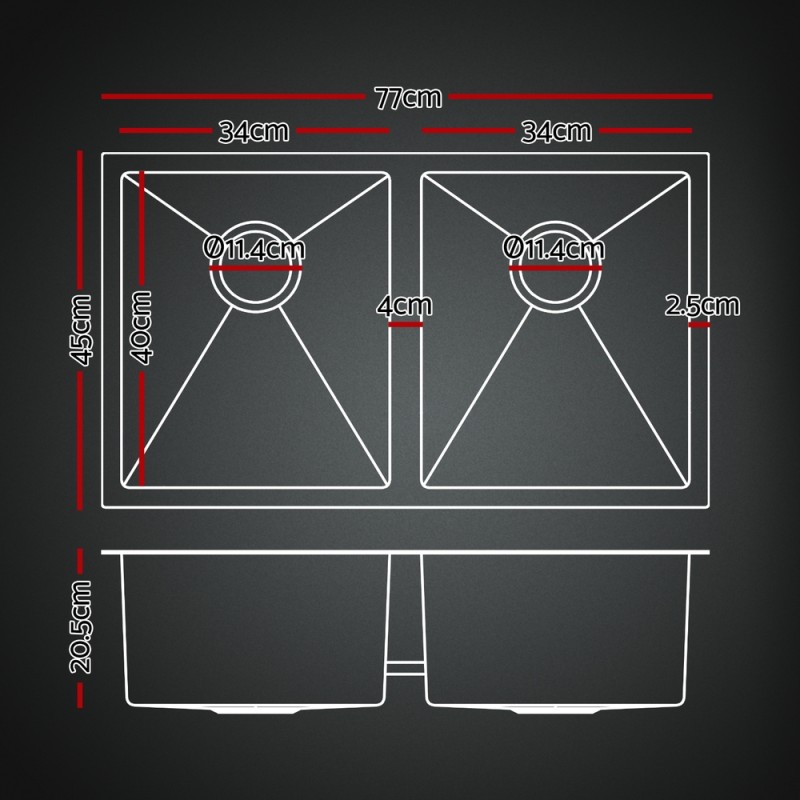 Upgrade your kitchen with the Cefito Stainless Steel Sink 77x45CM Double Bowl with Pull Out Mixer Tap. Crafted from heavy-duty 304 stainless steel and finished with advanced PVD coating, this modern sink is rust, scratch, and bacteria-resistant. The X-flume design ensures quick drainage, sound-deadening pads reduce noise, and R10 rounded corners make cleaning effortless. Featuring a 5-star WELS-rated pull-out mixer tap in matte black, this sink delivers style, durability, and versatile installation with a 5-year warranty.