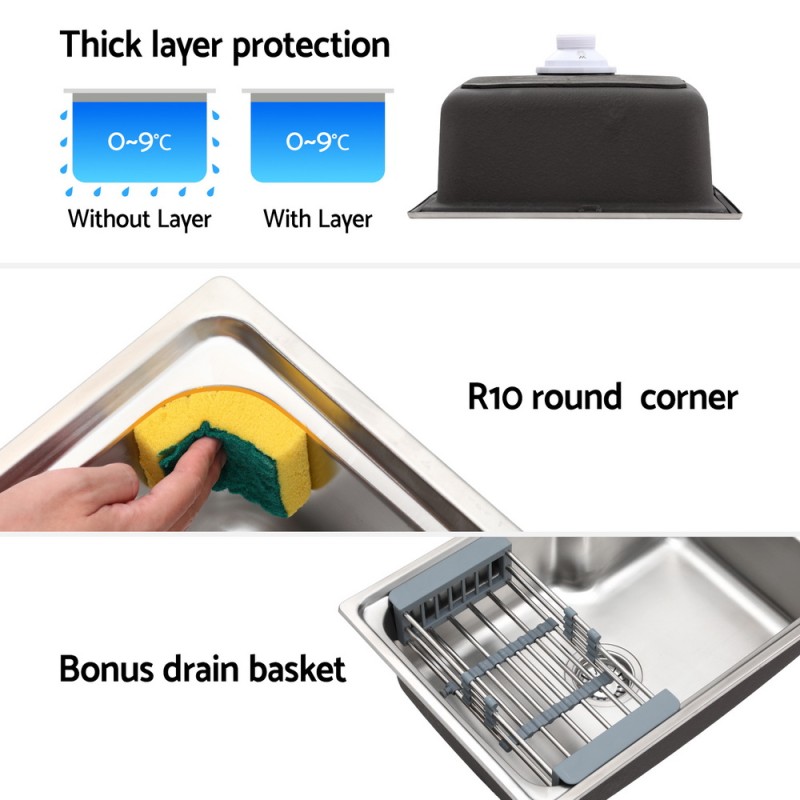 The Cefito Kitchen Sink is the epitome of style and functionality for your kitchen or laundry area. Made from heavy-duty, lead-free 304 stainless steel, this sink offers durability and a satin-coated finish for a sleek look. Its anti-condensation paint and R10 round corners ensure easy cleaning and lasting performance. Versatile in installation, it suits under-mount, flush-mount, and drop-in setups. Enjoy peace of mind with a Watermark certified water strainer and a 5-year warranty.