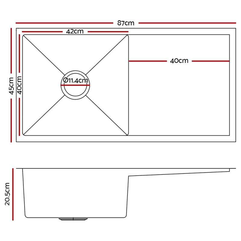 Discover the epitome of elegance and functionality with the Cefito Kitchen Sink. Crafted from premium food-grade 304 stainless steel, this 87x45cm single bowl masterpiece is designed to withstand the rigours of a modern kitchen. Its scratch-resistant, oil-proof surface ensures long-lasting beauty, while the X-flume design and five sound-deadening pads enhance practicality and comfort. With a versatile installation option for drop-in, flush-mount, or under-mount applications, this sink seamlessly integrates into any kitchen style.