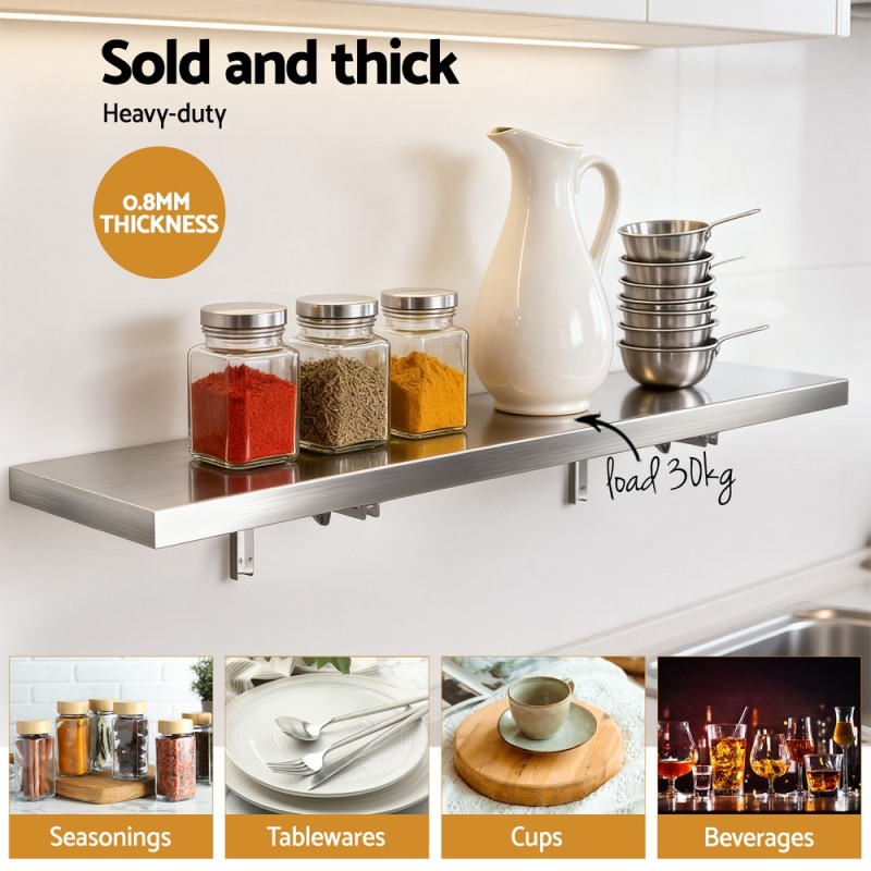 Transform your kitchen space with the Cefito Commercial Stainless Steel Wall Shelf Kitchen Storage Rack. Crafted from premium food-grade 201 stainless steel, this robust shelf offers a 30kg load capacity, making it ideal for both home and commercial kitchens. Its foldable design efficiently saves space while providing ample storage for your essentials. Easy to install and maintain, this sleek metal floating shelf adds a modern touch to any environment. Measuring 1200x300mm with a 0.8mm thickness, it promises durability and corrosion resistance, ensuring long-lasting functionality and style.
