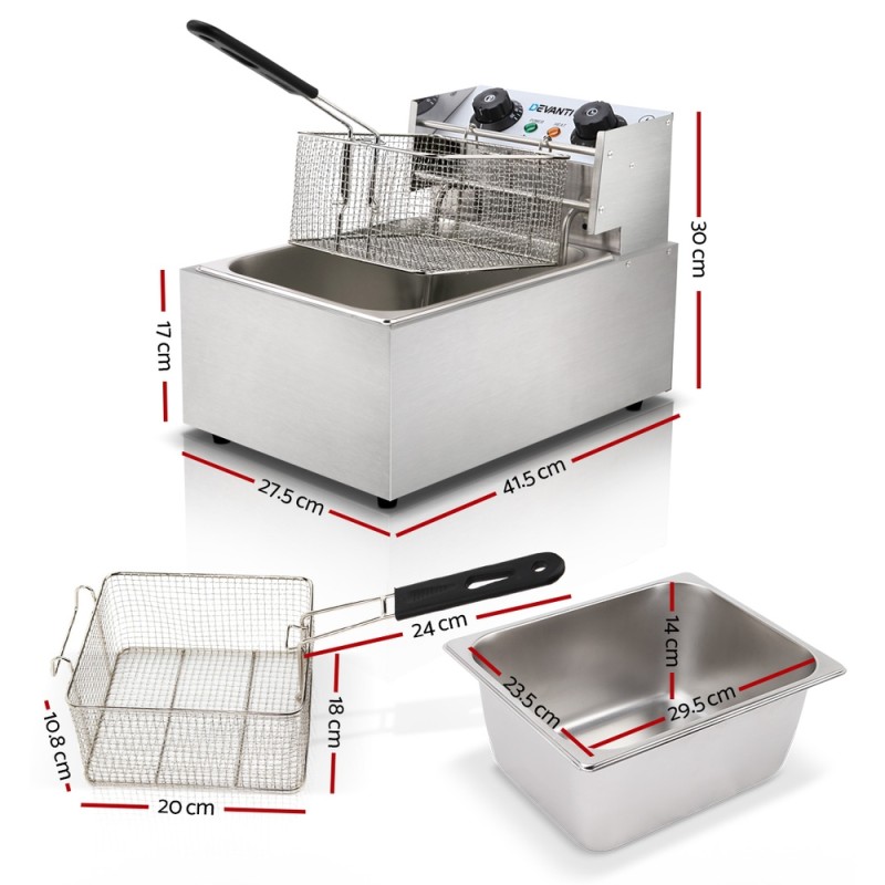 Introducing the Devanti 10L Electric Commercial Deep Fryer, your ultimate partner in the kitchen for achieving perfectly crispy dishes. This high-performance fryer is equipped with a power-saving auto thermostat, quick-heat function, and a convenient food fry temperature setting. Its stainless steel body ensures durability, while non-slip rubber feet offer stability. The hinged removable oil-heating plate and heat-proof handle basket make operation a breeze. Perfect for both home and certified commercial use, this fryer will elevate your cooking game, delighting family and friends alike. Simply turn the knob to the desired food type, and let the Devanti Deep Fryer do the rest. SAA certified for your peace of mind. Ensure to activate both the temperature control and timer knobs before frying.