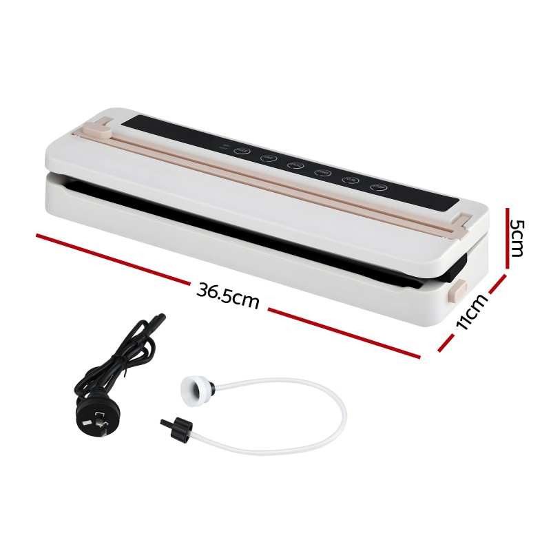 Keep food fresher for longer with the Devanti Food Vacuum Sealer. This 110W unit delivers up to 60KPa suction to create airtight seals, features six auto modes, touch LED controls and a clear timer, plus a 30cm sealing bar and built in cutter so you can customise bag sizes. The VAC function works with canisters and wine stoppers. Supplied with 10 vacuum bags and an accessory tube this compact white and pink sealer is ideal for meal prep and food storage.