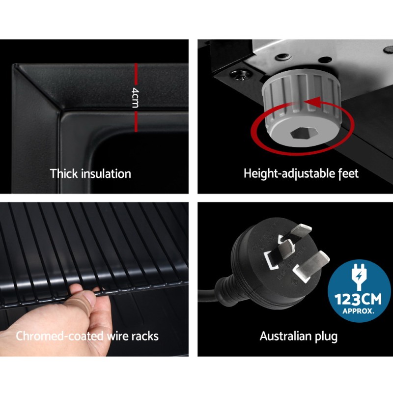 Introducing the Devanti 115L Bar Fridge, an excellent choice for those who need efficient cooling without compromising space. This compact fridge boasts a sleek black design with a double-glazed glass door and seven adjustable temperature settings, ensuring your food and beverages stay perfectly chilled. Its energy-efficient operation is supported by eco-friendly R600a refrigerant, while the extra thick insulation and built-in LED lamp enhance its functionality. Ideal for both home and commercial environments, the fridge features adjustable shelves, a built-in lock for security, and height-adjustable feet for stability. A cool investment you can rely on!