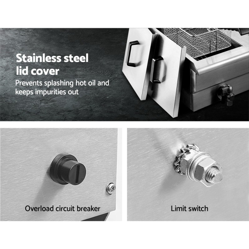 Introducing the Devanti 20L Electric Commercial Deep Fryer, an essential addition to any bustling kitchen. Crafted with food-grade stainless steel, this twin deep fryer ensures durability, versatility, and safety. Equipped with an S-shaped heating element, it promises rapid heat-up and consistent heat distribution. Enjoy independent frying compartments for simultaneous cooking at different temperatures. The fryer features heat-resistant handles, basket hangers, and stainless steel lids to prevent oil splashes. With convenient oil drain taps and a 90° tilting head, maintenance is a breeze. Safety is paramount with oil level indicators, a temperature probe, overload circuit breaker, and a non-slip base. This product requires a 15A power socket and includes a 1-year warranty.