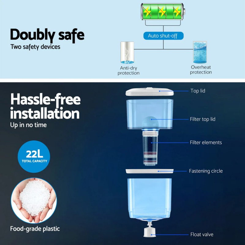 Enjoy on-demand purified water with the Devanti Countertop Water Cooler. The compact benchtop unit features a 22L refillable food grade container, a 7-stage filtration system with two replacement filters and three taps supplying hot cold and room temperature water for home or office convenience.