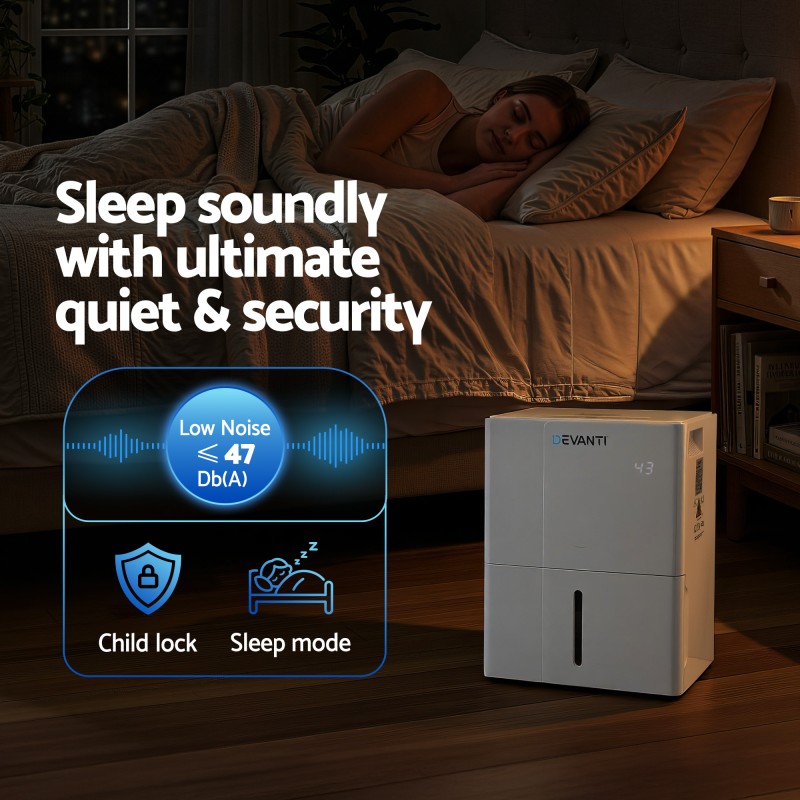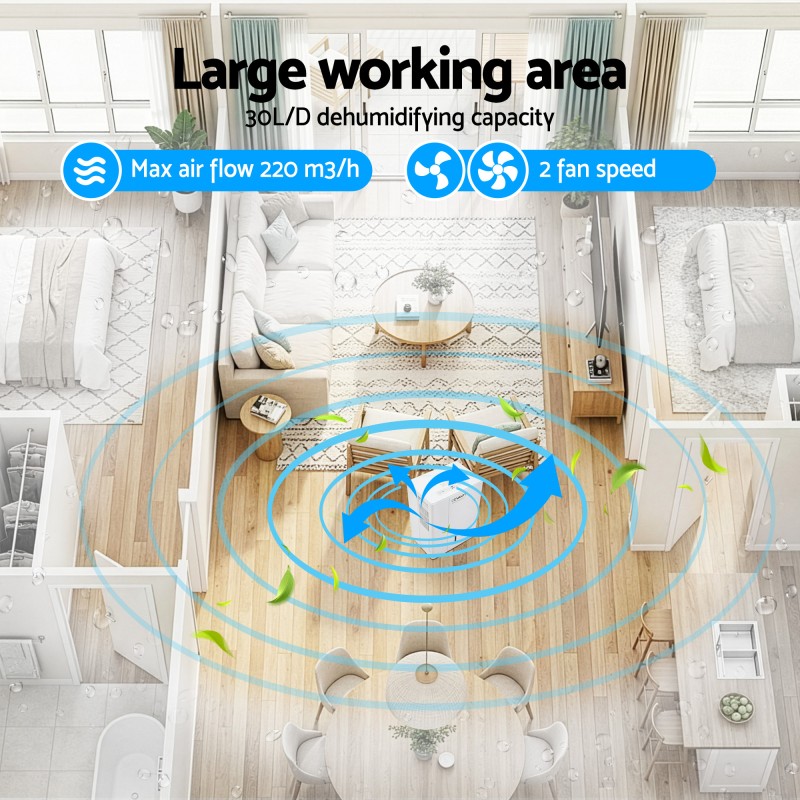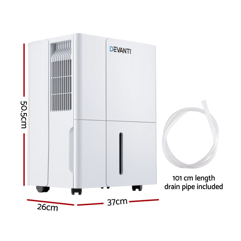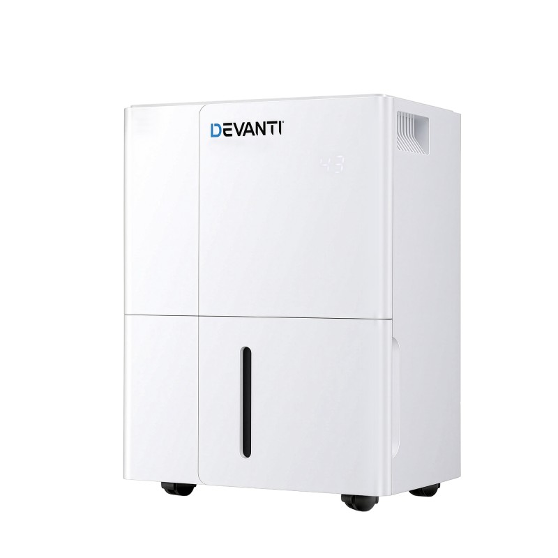 Breathe easy with the Devanti 30L/Day Dehumidifier & Air Dryer, designed for medium to large spaces. This powerful unit removes up to 30L of moisture daily, protecting your home from damp, mould and allergens. Four versatile modes, including fast laundry drying and ventilation, pair with a discreet front humidity display, soft touch controls, and a generous 4.7L tank with continuous drainage option. Enjoy a whisper-quiet Sleep Mode, 24-hour timer and effortless mobility on easy-roll casters—eco-friendly and efficient for year-round comfort.